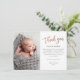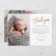 Cette photo moderne de remerciement note comprend un script manuscrit en or rose, un message personnel et une photo verticale sur le devant. Le dos comprend une deuxième photo bébé qui est une photo horizontale à fond saigné.