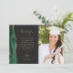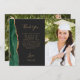 Envoyez à votre famille et à vos amis un remerciement spécial pour votre diplôme avec ces cartes photos personnalisés. Sur la gauche, les mots "merci" apparaissent dans une élégante typographie manuscrite couleur or sur un arrière - plan non-noir sur un bref message de remerciement, modifiable, aux invités de votre remise de diplômes en caractères compacts, avec votre nom ci-dessous. Une bordure d'aquarelle vert émeraude bordée d'une parties scintillant en faux or orne le bord gauche. Ajoutez une photo verticale à l'avant et une seconde photo horizontale à l'arrière de la carte.