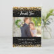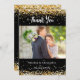 Un carte photo de Merci mariage moderne. Un arrière - plan noir décoré de faux confettis d'or. Personnalisez et ajoutez votre photo et merci note.