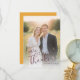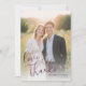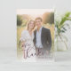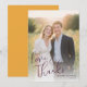 Cette carte de remerciement de mariage présente un design romantique et élégant avec une photographie d'un couple debout l'un près de l'autre dans un cadre extérieur, entouré de verdure luxuriante et de lumière douce. La palette de couleurs chaudes comprend des jaunes et des verts doux de l'environnement naturel, contrastés avec des teintes bleu marine profond et crème claire, créant un mélange harmonieux qui évoque des sentiments de chaleur et d'affection. La typographie est sophistiquée, avec "love & thanks" écrit dans une police de caractères cursive fluide dans le coin inférieur gauche, ajoutant à l'esthétique classique et intemporelle adaptée aux occasions formelles comme les mariages ou les fiançailles. L'ambiance générale transmise par le design est celle de la joie, de l'amour et de la célébration, renforcée par l'éclairage vif et les sourires sincères des sujets.