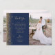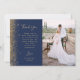 Envoyez à votre famille et à vos amis un mariage spécial merci avec ces cartes photos personnalisés. Une photo verticale apparaît sur la moitié droite. Sur la gauche, les mots "Merci" apparaissent dans une élégante typographie manuscrite couleur or sur un arrière - plan bleu marine sur un bref message de remerciement, modifiable, à vos invités mariages en caractères de cuivre, avec vos noms ci-dessous. Une bordure de parties scintillant en faux or orne le bord gauche. L'envers offre de l'espace pour une seconde photo horizontale.