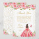 This elegant and glamorous birthday thank you card features a beautiful princess with brunette hair and fair skin in a pink ball gown. The text combines handwritten script and modern sans serif fonts for a classy and sophisticated look. The floral arrangements, butterflies and gold confetti create the perfect blend of rustic and chic.