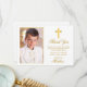 Élégante Première Sainte Communion Carte de remerciements avec Croix d'Or. Photo Avant. Cadre Or.