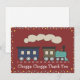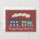 Un design mignon avec une locomotive à vapeur tirant une carte de passagers. Les couleurs sont un thème rustique avec du marron, du bleu et du sarcelle. Le fond est un rouge profond. Des étoiles bordant la carte lui donnent une atmosphère festive. Le devant dit Tchou tchou Merci. Personnalisez la carte avec votre message, elles sont idéales pour dire merci après une fête d'anniversaire sur le thème des trains pour enfants.