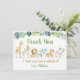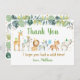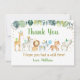 Cette adorable carte de remerciement d'anniversaire présente des animaux de safari aquarelle avec des accents de feuilles tropicales et des confettis en faux or.