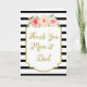 Carte de remerciement pour les parents de la mariée ou du marié le jour de votre mariage dans un motif classique à rayures noires et blanches, détails dorés vintage, fleurs roses et pêche rustiques et texte de style écrit à la main.