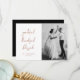 Cette carte de remerciements de mariage simple et élégante comporte les mots "reconnaissant, reconnaissant, béni" dans la typographie manuscrite en or rose moderne, faux. Il y a un endroit pour ajouter votre photo de mariage préférée, et le dos de la carte est d'une couleur noire riche.