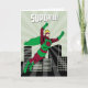 Superdad vole dans les airs devant une ville en silhouette et un coup de soleil. Sa tenue est rétro vert et marron avec des bottes et une cape. Donnez à Superdad cette carte mignonne pour la fête des pères. Design © 2015 Julia Bryant.