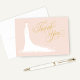 Cartes de remerciement élégantes pour une douche de mariée ou un mariage pour la mariée stylée comportant une police de caractères calligraphiée ornée et une robe de mariée fluide. Les détails de la volute, de la fleur et du papillon accentuent la robe éthérée. Le format de carte pliée comprend un espace à l'intérieur pour un message manuscrit. Les couleurs du design incluent un schéma de couleur rose poudré pâle, blanc et or