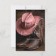 Une image magnifiquement composée qui capture l'essence d'un mariage à la campagne, mettant en vedette une paire de bottes de cowboy marron finement détaillées associées à un chapeau de cowboy rose tendre. Installée sur un fond en cuir rugueux ; une texture de cuir également sur le dos de la carte, la scène évoque le charme, la tradition et l'élégance western - parfait pour la mariée ou le marié moderne qui apporte une touche de charme campagnard à son grand jour.