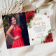 Personnalisez facilement et rapidement cette carte de remerciement de photo d'anniversaire Quinceañera / 16 ans boho chic avec des fleurs rouges vibrantes. Cliquez simplement sur le bouton Personnaliser davantage pour modifier les textes, changer les polices et les couleurs des polices. Comprend de belles roses rouges vives et des papillons rouges et or. Articles assortis disponibles en magasin. (c) Somerset Fine Paperie