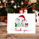 Cute baby boy shower folded thank you card featuring "thank you" in a stylish red script with swashes and a watercolor of a baby elephant with a Santa hat, a Christmas tree, a red and green candy cane and presents. On the inside, personalize your thank you message in simple lettering or leave blank for a handwritten note.