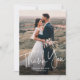 Un Script moderne Simple Mariage Photo Carte de remerciements avec police manuscrite pleine saignée photo de portrait sur le devant avec le nom et les détails mariages. Le dos a une deuxième photo avec un message de remerciement des jeunes mariés. Cliquez sur le bouton Modifier pour customiser cette conception.