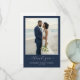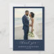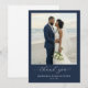 This wedding thank you card features a stunning beach photograph framed by a deep navy blue border, creating an elegant and serene composition. The color palette includes soft natural tones of beige sand, light blue sky, and white floral elements, contrasted beautifully with the navy frame. The design uses a digital print technique to capture realistic details, enhancing the lifelike representation of the intimate moment shared on the beach. Below the photo, "thank you" is elegantly scripted in cursive, emphasizing gratitude, while customizable placeholders for names and dates allow personalization. The overall mood is heartfelt and celebratory, perfect for expressing appreciation after a memorable wedding day.