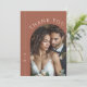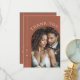 Vos invités de mariage seront ravis de recevoir cette élégante carte de remerciement de mariage en terre cuite rustique avec une photo spéciale de votre jour de mariage. Simple, élégant et de bon goût, ce design classique présente une fine bordure le long du bord gauche avec les initiales du monogramme de la mariée et du marié. De belles lettres serif écrivent "Merci" en texte courbe au-dessus du modèle de photo d'arche. Remplacez la photo exemple par votre photo sélectionnée. Le verso de la carte comporte un modèle de texte avec un exemple de message de remerciement que vous pouvez utiliser tel quel ou personnaliser avec vos propres mots, ainsi que les noms de la mariée et du marié.