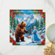 Un paysage hivernal magique avec un Maiden de Neige habillé d'une robe bleue interagissant avec une bière. Des montagnes enneigées et des décorations festives rehaussent l'atmosphère saisonnière et paisible.