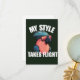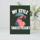 Le perroquet présente un plumage lumineux et coloré, principalement dans les tons rose et bleu, avec un bec noir. Il porte de grandes lunettes de soleil réfléchissantes avec une teinte rose, ce qui lui donne un aspect tendance et à la mode. Les plumes de l'oiseau sont hérissées dans un style dynamique et pointu. Autour du perroquet est un texte blanc et gras qui dit "MON STYLE PREND LE VOL", mettant l'accent sur le comportement cool et confiant du perroquet.