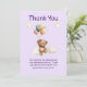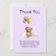 A thank you card featuring a cute teddy bear hanging on to a bunch of colorful balloons flies through the clouds with a couple of stars overhead. All text can easily be changed or deleted if you prefer a hand-written note.