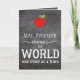 Chalkboard folded thank you greeting card with red apples, teacher name and white typography script inspired from the quote "teachers change the world one child at a time". Personalize it with your teacher's name on the front and your text and signature inside and make it a thoughtful thank you gift for your best educator / mentor.