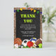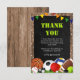 Ces cartes de remerciement d'anniversaire sont un changement de jeu ! Thème de sports colorés et amusants, avec un fond en bois rustique et un tableau noir, décoré de petites étoiles blanches, d'une bannière arc-en-ciel, d'herbe verte et d'un ensemble d'équipements sportifs (ballon de football, ballon de volley, ballon de basket, palet de hockey, ballon de rugby, balle de tennis, boule de snooker, balle de golf et même une balle de ping-pong !). Le modèle de remerciement moderne est facile à personnaliser. Pour changer la couleur du texte, la police ou la taille, cliquez simplement sur "personnaliser davantage".