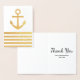 Ce carte de remerciements nautique personnalisé peut être détaillé en feuille d'or ou d'argent. Le design comporte une ancre sur les rangées supérieures de bandes nautiques. La finition de feuille sera mémorable pour ceux qui la reçoivent. L'intérieur de la carte peut être mis à jour pour inclure un message de remerciement personnel. Cette carte est idéale pour envoyer des remerciements pour les mariages et les anniversaires, ou peut être utilisé pour la correspondance décontractée.