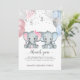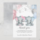 Faites connaître votre gratitude à vos invités avec cet adorable carte de remerciements de baby shower avec des bébés éléphants à deux tons bleu et gris rose avec des ballons et des confettis. L'arrière présente une aquarelle gris doux. Facilement customisé en cliquant sur personnaliser.