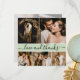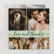 Élégante carte de remerciement de mariage "Love and Thanks" avec collage de 5 photos sur fond vert sauge. Modèle moderne de carte de remerciement de mariage comportant cinq (5) photos sur le devant et une (1) photo sur le verso. Avec le texte calligraphié "Love and Thanks" dans une police manuscrite avec des fioritures en blanc sur un fond de couleur vert sauge doux ou vert sauge poussiéreux. Ajoutez votre nom et un message personnel de remerciement. Si vous préférez écrire votre note à la main, il suffit de supprimer le texte d'exemple pour faire plus de place. Si vous avez besoin de personnalisations ou d'articles assortis, veuillez contacter le concepteur !