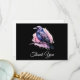 Carte de remerciements à l'image d'un corbeau noir aux ailes violettes roses. Une aquarelle rose derrière cet oiseau mystique.