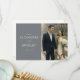 This wedding thank you card features a split design with a modern, elegant aesthetic. The left side showcases a solid gray background with clean, white sans-serif text, while the right side displays a soft-focused photograph of two individuals walking hand-in-hand in an urban setting, dressed formally and holding a bouquet. The color palette is muted, combining grays, whites, and natural tones for a sophisticated look. The overall mood is warm and celebratory, making it perfect for expressing gratitude after a special occasion.