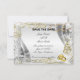 Élégant avec des tourbillons dorés, des accents de diamant et des anneaux de mariage en or. Cette belle carte de remise à date est une façon élégante d'annoncer votre grand jour. Personnalisez la carte en modifiant le texte dans les champs fournis. Vous pouvez changer le style, la taille et la couleur de la police.