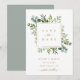 Cette invitation de remise de date de mariage présente des feuillages de eucalyptus peints à l'aquarelle, des feuilles vertes et un cadre carré doré. Pour une personnalisation plus avancée de ce design, veuillez cliquer sur le lien "Personnaliser davantage". Des articles assortis sont également disponibles.