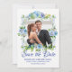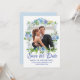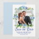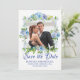 Mettez en valeur la photo du couple préféré tout en annonçant la date du mariage. Un cadre romantique entoure votre photo. De belles fleurs bleues et blanches créent une ambiance romantique. Save the Date est écrit ci-dessous dans une police de caractères formelle et élégante. Vos noms sont en lettres majuscules. La date et le lieu suivent. Très facile d'insérer votre propre photo et texte.
