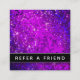 Incitez les clients à référer leurs amis et leur famille avec ces cartes de référence avant mode avec du texte personnalisable en noir et blanc. Idéal pour les spas, les cours de méditation, les entraîneurs de vie, les professeurs de yoga, les thérapeutes, les salons et les boutiques. Ce design mémorable présente un design audacieux de parties scintillant violet encourageant les clients à diriger un ami. L'envers est facilement personnalisable avec votre message, votre nom d'entreprise et vos coordonnées. Le modèle est facile à écrire dans des espaces pour le nom du référent et de la nouvelle clientèle.