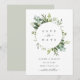 Cette invitation de rendez-vous de mariage comprend de la verdure d'eucalyptus peinte à l'aquarelle, des feuilles vertes et un cadre circulaire. Pour une personnalisation plus avancée de ce design, veuillez cliquer sur le lien "Personnaliser davantage". Des articles assortis sont également disponibles.