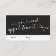 Carte de rendez-vous moderne et élégante pour coiffeurs avec ciseaux d'or rose en faux cuivre, arrière - plan noir et police de calligraphie élégante.