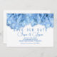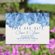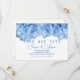 Cartes de rendez-vous florales avec une bordure de fleurs d'hortensia bleu clair en haut. Personnalisez le texte bleu, sur papier horizontal - présenté sur un papier de qualité supérieure - avec les prénoms de la mariée et du marié, deux ou trois lignes pour le lieu (incluez un site web de mariage si nécessaire), et la date, et une ligne pour informer les invités qu'une invitation formelle suivra. Le verso est blanc. Ce design est également proposé en téléchargement instantané.