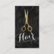 Élégant Motif de cheveux noir et blanc Arrière - plan avec Carte de visite de salon de coiffure Faux Gold Scissors. Elégant rendez-vous salon de coiffure noir et or rappel cartes de visite avec une paire de ciseaux en faux or Personnalisez en entrant les informations de la coiffeuse professionnelle ou coiffeur.