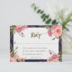 Un magnifique design floral/fleur sauvage bohème sur fond marine, et fond marine complémentaire. Utilisez cette carte de RSVP coordonnée pour encourager vos invités à répondre rapidement ! Modifiez les champs de texte disponibles en fonction de vos besoins, pour créer la parfaite suite de mariage. D'autres articles et papeterie de cette collection, tels que des autocollants de faveur, une carte d'information, des numéros de table, etc. ! Parfait pour les mariages et les fêtes/événements à tout moment de l'année, mais particulièrement adapté au printemps et à l'été. Un design très élégant.