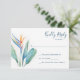 Cette carte de réponse à un mariage chic tropical comporte une bordure latérale de fleurs aquarelles avec un feuillage botanique luxuriant et de la verdure. Personnalisez avec vos détails de RSVP dans un script manuscrit moderne et une lettre sans serif traditionnelle. Dos de la carte de réponse en couleur unie bleu-vert marine riche. Parfait pour les mariages de jardin, d'été, de destination ou de plage. Pour voir plus de conceptions comme celle-ci, visitez www.zazzle.com/vginvites