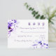 Le design élégant de Violets présente l'image de deux jolis bouquets de violettes de dainty exposés dans les coins supérieur gauche et inférieur droit. Suit le format traditionnel d'une carte de réponse. Le texte est dans une police Old English dans un violet violet. Conçu dans le cadre de l'élégante Suite Mariage Violets.