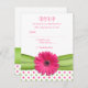 Pretty green and rose poka dot rose gerbera daisy carte de réponse bat mitzvah (rsvp). Le texte de cette carte est entièrement personnalisable. Pour modifier le texte, utilisez les options de personnalisation. Pour des modifications plus étendues du texte, telles que des modifications de la police, de la couleur de police ou de la disposition du texte, choisissez l'option customiser. Cette invitation à la pochette rose chaud et vert printemps est actuellement customisée comme une carte de réponse, mais elle fonctionnerait bien comme une carte de réception, direction, hébergement et/ou d'insertion d'informations générales. Note : Il s'agit d'un design imprimé à plat sans embellissement en relief ou en 3D.