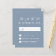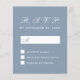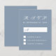 Une simple carte de réponse budgétaire minimaliste pour un mariage. Elle n'a que du texte blanc sur fond bleu poussiéreux. Le titre RSVP et la lettre M sont écrits dans une écriture calligraphique élégante, le reste en majuscules.