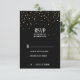 Cette carte de réponse RSVP d'anniversaire à confettis dorés sur fond noir est parfaite pour une élégante fête d'anniversaire de mariage. Le design présente de faux confettis pailletés dorés sur fond noir avec une calligraphie blanche.