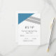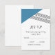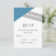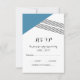 Carte RSVP de mariage géométrique moderne et tendance avec un triangle bleu et un accent à rayures minces. Cette carte de réponse simple mais élégante est configurée pour être facilement customisée avec vos informations de mariage. Pour plus d'options de personnalisation, cliquez sur Customiser.