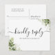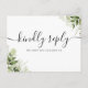Une élégante carte de réponse de signature noire et blanche avec typographie chic avec des feuilles de verdure. Le verso présente vos coordonnées et une demande de chanson d'invité amusante. Conçue par Thisisnotme©