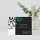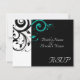 Carte de réponse pour correspondre à notre invitation de mariage à tourbillon inversé aqua noir et blanc, avec un fond de feuille de défilement en tourbillon graphique gras. Personnalisez en ligne avec les détails de votre mariage.