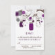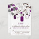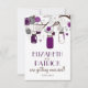 Illustrations fantaisistes de pots Mason violets suspendus à un arbre avec des ficelles en forme de cœur, deux tourtereaux et une variété de fleurs. Cette carte de réponse de mariage comporte des articles assortis. Cette invitation de pot Mason serait parfaite pour des mariages de printemps, d'hiver et en plein air.