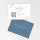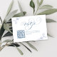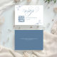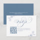 Élégante carte de réponse de mariage en bleu poussiéreux avec une écriture calligraphique romantique et des accents botaniques à l'aquarelle douce. Cette carte de réponse minimaliste comprend un code QR scannable pour une réponse en ligne facile, ce qui la rend parfaite pour les mariages modernes. La mise en page épurée se marie à merveille avec les suites de papeterie de mariage classiques, de jardin ou de thème bleu poussiéreux. Entièrement personnalisable avec votre site web de mariage et les détails de l'événement.
