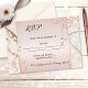 Une jolie carte de réponse de mariage avec des volutes florales rose doré et un design rose pâle sur un fond de marbre avec de légincelles. Cette carte de réponse correspond aux invitations et fait partie d'une collection de mariage.