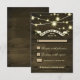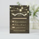 Cartes de réponse de mariage rustique avec fond en bois en détresse, guirlande lumineuse scintillante et typographie élégante avec une banderole.